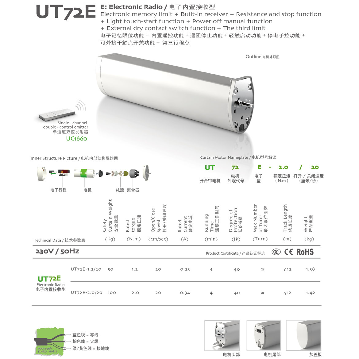 電子記憶限位功能+內置遙控功能+遇阻停止功能+輕觸啟動功能+停電手拉功能+第三行程點功能+可外接干觸點開關功能